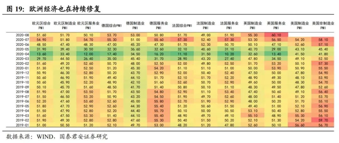 欧洲方面,经济也在持续修复。7月以来,可以看出欧元区PMI在持续好转,尤其是英国的服务业PMI,8月录得60.1,进入了高景气度区间内。