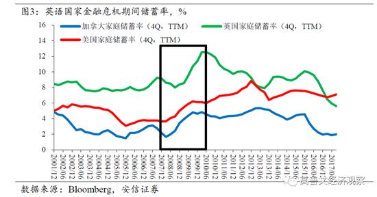 观察英语为母语的国家在金融危机期间储蓄率的变化,可以发现金融危机的影响相当长久。如图3所示,美国家庭储蓄率在2012年底达到高点后持续处于高位,加拿大在2016年才回落到危机之前的水平,英国在2013年左右恢复。金融危机之前美国的储蓄率长期下降,被认为处于不正常的低水平,并且是导致危机的原因。金融危机后花了很长时间去修复,既包括修复资产负债表,也包括修复储蓄行为本身,危机后的储蓄率的上升是对危机前的长期趋势的系统性修正,不完全是危机冲击的结果。