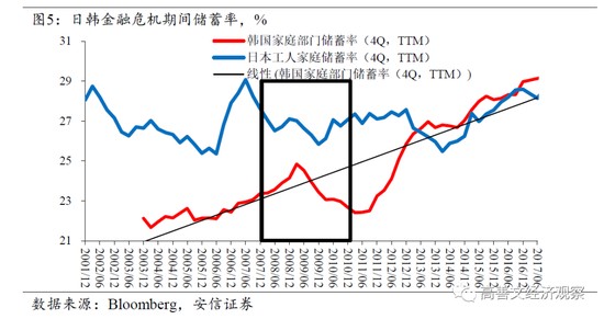相比日韩,中国城镇居民部门的数据显示中国受到的冲击更小,而且早在2009年就基本恢复到了危机前的水平。
