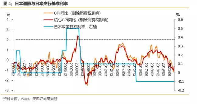 二、日本央行于2016年9月便引入“通胀超调承诺”,表示将会持续进行货币宽松直到CPI(不含新鲜食品)同比增速超过并稳定地保持在2%的目标之上,这比美联储的“平均通胀目标制”早了4年。