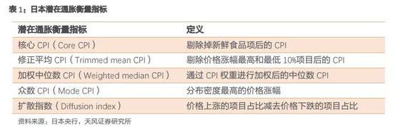 日本央行主要关注潜在通胀。日本央行会同时观察多种潜在通胀的衡量指标[2],但实际上使用最为频繁的仍是核心CPI(即剔除新鲜食品项后的CPI,下同)。日本央行曾指出核心CPI和修正平均CPI对于潜在通胀的跟踪和预测略好于其他指标。