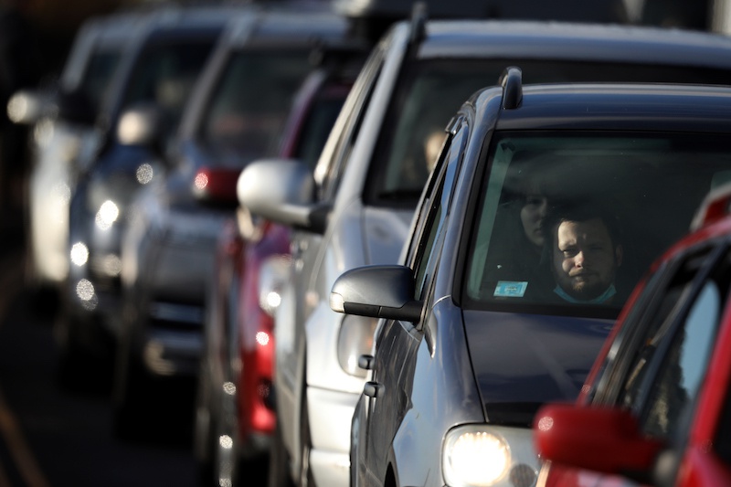 2020年12月24日,英国多佛港,大批卡车司机开着卡车在公路上滞留等待做检测过境。圣诞节在即 大批车辆滞留英法边境等待回家。