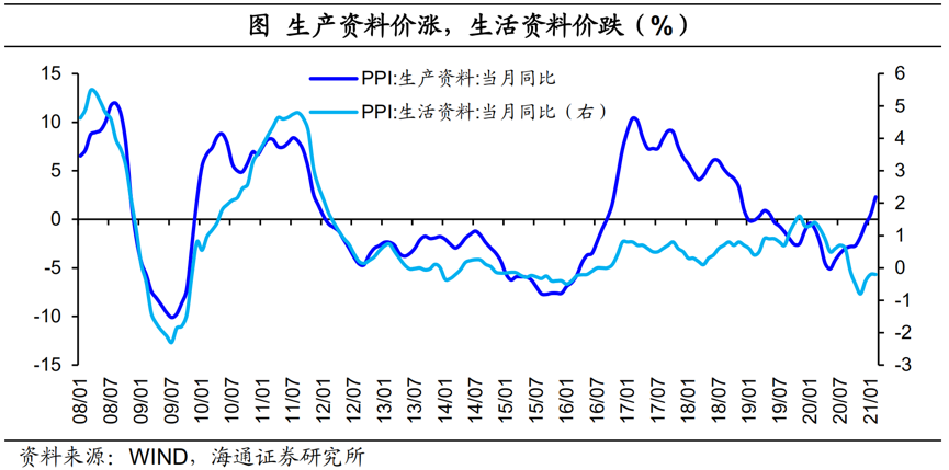 地产强、消费弱的经济结构分化,从通胀的角度也能看得出来,目前我国是一半通胀压力、一半通缩压力。去年下半年以来,我国PPI同比增速大幅反弹,但主要是生产资料带动的,而生活资料的价格是比较低的。一方面,在房地产投资拉动需求、供给端又受到疫情扰动的背景下,大宗商品价格持续上涨。另一方面,海外需求的恢复拉动了国际油价的回升,所以大宗商品面临通胀的压力。
