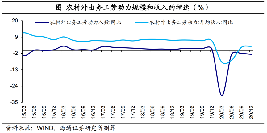 截至2020年4季度,我国农村外出务工人员相比2019年同期回落2.7%,降幅有所扩大。同时,该群体的月均收入增速仅为2.8%,大幅低于疫情之前6.5%的水平。