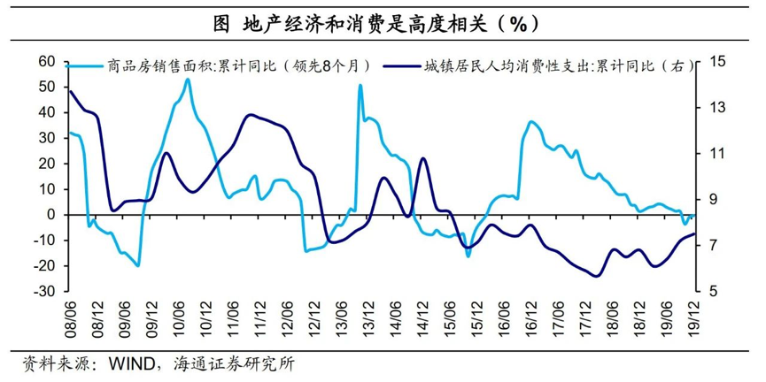在以往我国的经济周期中,地产经济和消费是高度相关的。在2009年,地产引领经济复苏,商品房销售大幅增加,随后居民消费支出也企稳回升。在房地产对经济增长贡献突出的年份,比如2012年、2015年,这种规律也相继重现。可以说,房地产是主导我国消费波动的重要力量。