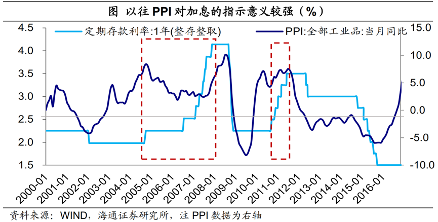 从以往的情况来看,PPI对于我国货币政策的指示意义较强。2015年之前,每当PPI同比达到较高位置(4%以上),央行都会选择提高基准存贷款利率。2015年之后,货币政策调控框架做了调整,DR007成了反映政策利率走势的指标,但是2016年DR007的大幅抬升,也是建立在PPI同比大幅走高的基础上的。