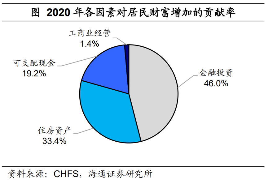 地产经济之所以能够带动消费,主要有两方面的原因:一方面是财富效应的结果。当地产销售向好,房价随之提升,财富的增加使得居民提高消费水平。2019年,在居民家庭的资产配置中,住房资产的比重高达69.9%,这使得房价上涨成为居民财富增加的主要因素。根据2020年中国家庭金融中心的调查,住房资产对居民财富增加的贡献率为33.4%,远高于现金、工商经营等因素的影响。