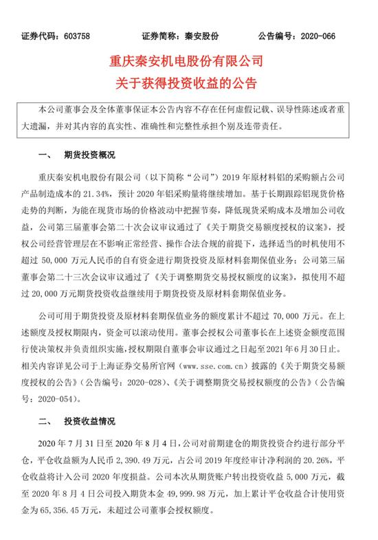 秦安股份的投资主要在于原材料铝的期货投资。2019年原材料铝的采购额占产品制造成本的21.34%,约1.14亿元。秦安股份称基于长期跟踪铝现货价格走势的判断,为能在现货市场的价格波动中把握节奏,降低现货采购成本及增加公司收益,同意使用不超过5亿元人民币投资原材料套期保值业务及期货投资(期货投资品种不限于铝)。公司董事会继5月份授权期货交易额度5亿元后,又于7月份增加了2亿元额度,合计7亿元。