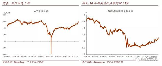 随着疫苗方面的积极进展、美联储的“缩表”讨论暂且搁置,以及经济活动尤其是生产端与疫情的逐渐脱钩,市场情绪在2月份发生了变化,或者更准确的说,市场重回“再通胀”之路,复苏深化的预期也再次得到加强。具体到资产表现方面,全球主要风险资产表现亮眼,而美元黄金美债等避险资产再次走弱。作为“再通胀”风向标的新兴市场货币自1月底以来上涨2%,其中南非兰特领涨5%[4]。在主要风险资产中,最为瞩目的还属石油。过去两周,油价飙升14%,拉动美国通胀预期,进而10年期美债利率走高近20个基点以突破1.2%的点位,这再次引发了市场对通胀前景和股市的担忧。实际上,我们认为这是复苏深化过程中“再通胀”的具体体现以及相应的,市场情绪的再修复。