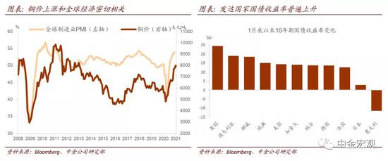 在此过程中,随着复苏深化和盈利预期改善,风险资产往往受益。除去石油供给扰动的短期影响外,全球需求复苏深化和风险偏好提振——即“再通胀”因素——对油价上涨贡献了多少?这里我们借助铜价做粗略估算。石油和铜,分别作为工业的血液和筋骨,其价格一定程度上反映了全球需求的强弱。相比于石油,铜较不易受到供给和投机扰动,因而能较好地反映全球需求和增长动能。如下图所示,铜价与全球制造业PMI高度关联,且能以更高频率和更及时地反映全球需求强弱。自1月底以来,铜价上涨7%,因此我们可以粗略认为“再通胀”因素贡献了同期油价涨幅的一半左右。