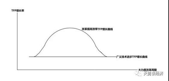 这其实证明了在转轨国家中TFP不全由广义技术进步创造,而当大比例的TFP来自于周期性的改革。转轨国家TFP增长的倒U曲线与市场经济国家的平缓曲线间的积分,就是改革盘活闲置和低利用要素形成的新增产出。