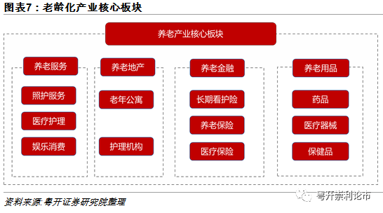 从养老服务的角度,老年人的需求核心为日常的生活照料和护理服务,未来,包括机构养老和居家养老在内的优质养老服务有望得到老年人的进一步青睐;养老地产是与养老服务紧密相连的产业,主要包括老年公寓和护理机构,保障养老项目的持续经营;养老金融主要包括养老保险和看护险等,经济实力较强的老年人还可以选择灵活多样的高端私人养老保险;养老用品主要包括保健品、药品、医疗器械,随着居民年龄的提升,创新药、创新医疗器械等领域有望迎来高景气度。