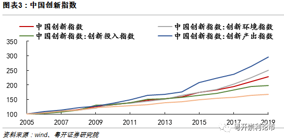 一方面,要为市场主体“松绑”,鼓励竞争。竞争为创新、经济发展提供活力。2019年中国创新指数为228.3,较2005年翻了一番,创新产出指数更是接近翻了两番。但是我国的科技创新仍面临一些问题,一是创新成效转化不充分,创新成效指数增长斜率低于环境、投入等指数,二是创新投入增速慢于创新产出增速,创新投入有待进一步加强,三是部分核心技术仍受限于其他国家,部分基础研究发展较慢。继续推进“放管服”改革,让市场主体不仅生存而且活跃,鼓励技术转化、产研互补,有助于促进创新氛围和经济活力。