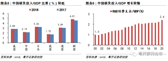 总理表示,要建设科技强国,提升科技创新能力,一是打造基础研究根基。目前我国部分基础研究发展较慢,如具有极高技术壁垒的半导体芯片,由于主要发达国家的技术限制、研发投入大、研发周期长、研发人才队伍不完善等因素,仍与发达国家有一定差距。目前半导体项目在国自然科学基金经费投入中仅占2-3%,扶持力度尚待加强。从2000年至2020年,我国研发投入占GDP的比重从1.0%上升至2.4%,,但增速仍有待提升,且与其他发达经济体相比,我国的研发投入占比较低,未来要继续增加研发投入和基础研究投入。