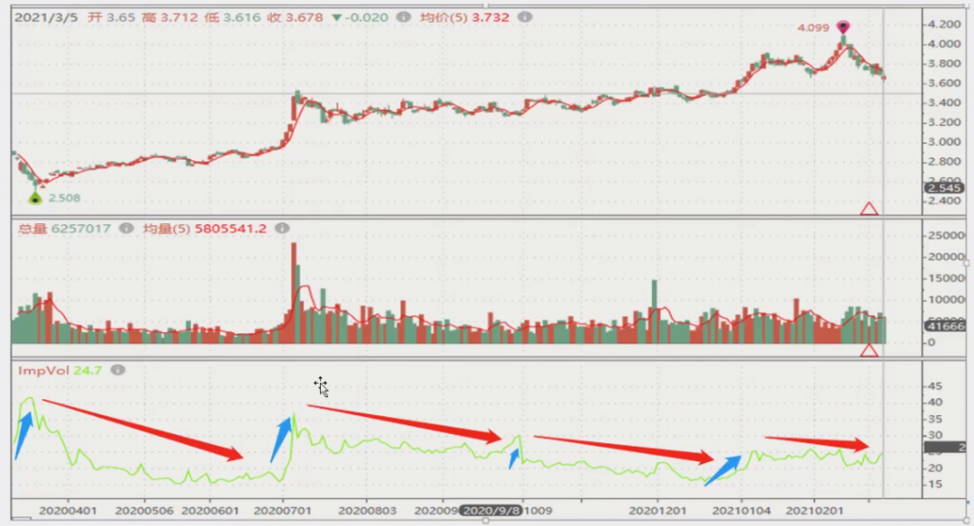 图中上方是标的走势,下方绿线是隐含波动率走势。可以发现,隐含波动率中的红色箭头和蓝色箭头,它们的幅度、斜率以及时间跨度是完全不一样的。