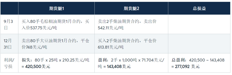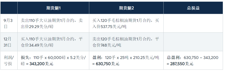 9月3日,一位交易者希望建立一个3000吨的BOPO价差空头头寸。该交易者以每磅29.29美分的价格卖出110手大豆油期货,并以每吨537.75美元的价格买入120手马来西亚毛棕榈油期货2。该交易者随后于12月31日平仓,大豆油期货平仓价为每磅34.49美分,毛棕榈油期货平仓价为每吨748美元。这期间,以美元/吨计价的BOPO价差从107.98美元降至12.37美元。在这个例子中,总利润为287,550美元。相反,如果交易者选择做多价差,两个期货合约的盈亏将会反转,导致287,550美元的总亏损。