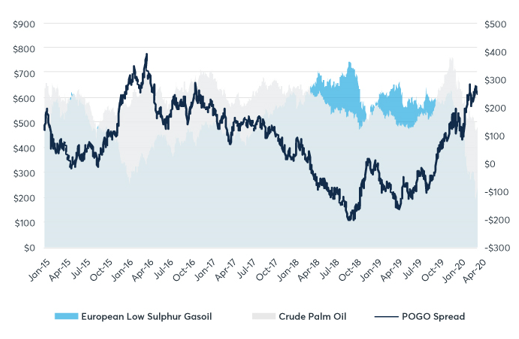 亚洲的运输燃料市场主要以棕榈油为基础,没有像菜籽油之类可行的作物原料。生物柴油与低硫柴油市场密切相关,生物柴油是道路柴油(低硫柴油)的原料。因此,这两种产品之间的期货价差交易活跃。这一价差被称为棕榈油与低硫柴油价差,或POGO价差。