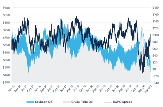棕榈油是世界上最大的植物油类别,与豆油共同争夺着全球市场份额。使用植物油作为生物柴油原料,令棕榈油市场和柴油市场产生关联。BOPO价差和POGO价差代表了这些商品之间的联系,是重要的市场指标。