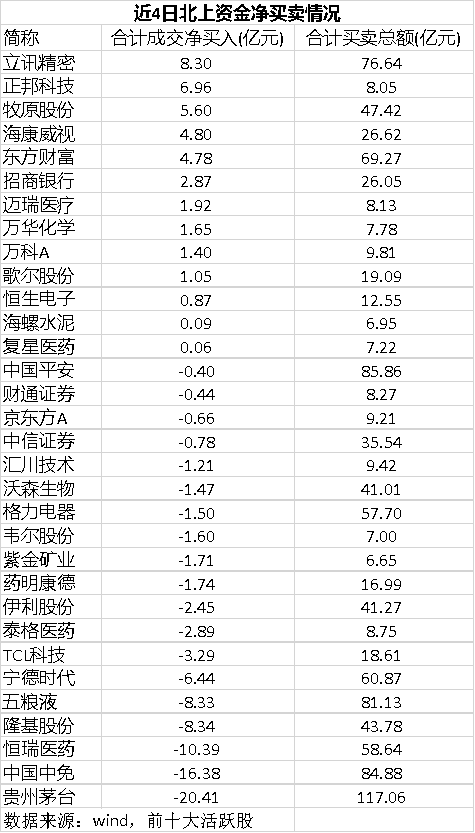 从前十大活跃股来看,北上资金净卖出期间,贵州茅台、中国中免、恒瑞医药、隆基股份与五粮液净卖出金额居前,其中两只白酒股净卖出金额分别为20.41亿元、8.33亿元。