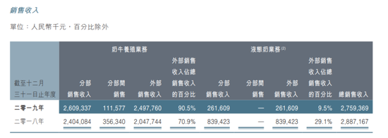 2019年,公司总收入录得27.59亿元,同比上涨17.2%。具体收入方面,奶牛养殖业务收入26.1亿元,同比上涨8.6%;液态奶业务收入2.62亿元,同比下滑69%。