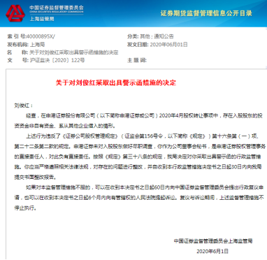 此次处罚涵盖两项,一则对申港证券采取责令改正的行政监管措施,二则对直接责任人董事会秘书刘俊红采取出具警示函的行政监管措施。