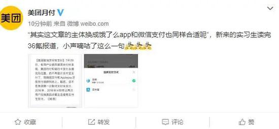 但没过多久,饿了么官博甩出两张图片力证自己可以使用微信支付。进而美团月付在晚上九点再次回应此事,顺便发出灵魂的质问:“淘宝啥时候能用微信支付、美团月付呢?”