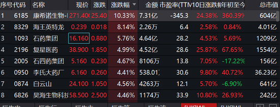 医药股继续强势,康希诺生物涨10%,石药集团、复星医药等涨5%,石四药、白云山等涨超4%。