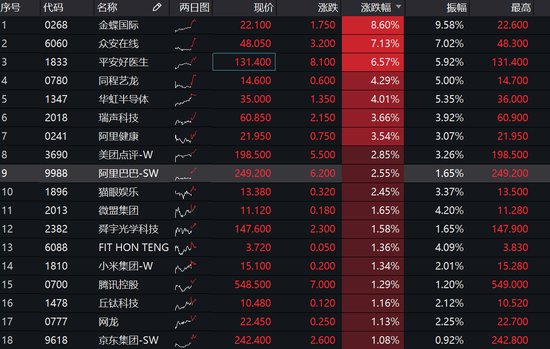 恒生科技指数大涨,金蝶国际涨8.6%,众安在线涨7%,平安好医生涨6.6%,同程艺龙涨4%,美团、阿里涨超2%,小米、京东、腾讯等涨超1%。