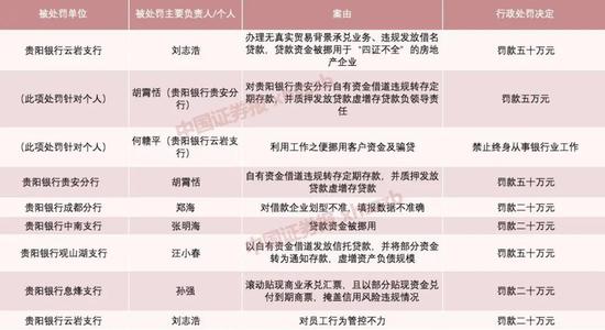 贵阳银行云岩支行因办理无真实贸易背景承兑业务、违规发放借名贷款,贷款资金被挪用于“四证不全”的房地产企业违法违规行为,被罚50万元,因对员工行为管控不力被罚20万元;