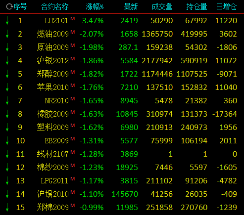 热点栏目7月31日,国内期市早盘多数下跌,受国际油价大跌影响,能化板块跌幅居前,低硫燃油跌逾3%,燃油跌逾2%,原油、甲醇跌近2%;贵金属走跌,沪银跌近2%;农产品飘红,豆一、淀粉涨逾1%,玉米涨近1%。
