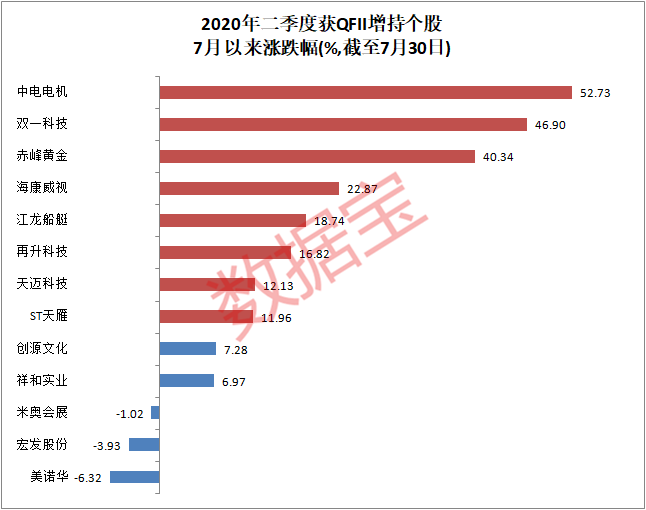 统计显示,从7月份以来的市场表现来看,截至7月30日沪指月度上涨10.12%,以上13只获QFII增持个股有8股跑赢大盘,中电电机涨幅居首,超过50%;双一科技、赤峰黄金涨幅均超过40%。