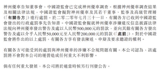 新浪港股讯 8月3日消息,中国证监会拟就神州优车涉嫌违反信息披露法律法规向神州优车发出警告及处以人民币500,000元的罚款,并向其余有关各方发出警告及处以介乎人民币50,000元至人民币200,000元的罚款。对于中国证监会将作出的以上处罚,有关各方享有发表陈述、申辩及要求听证的权利。