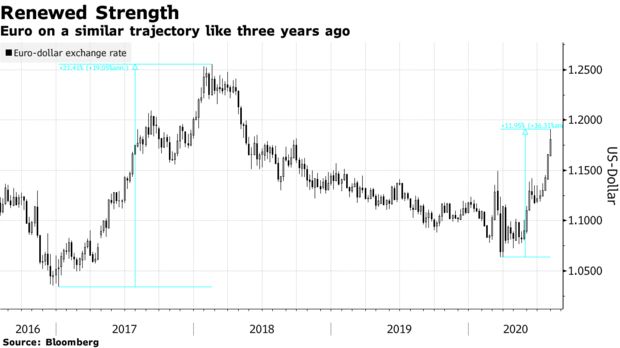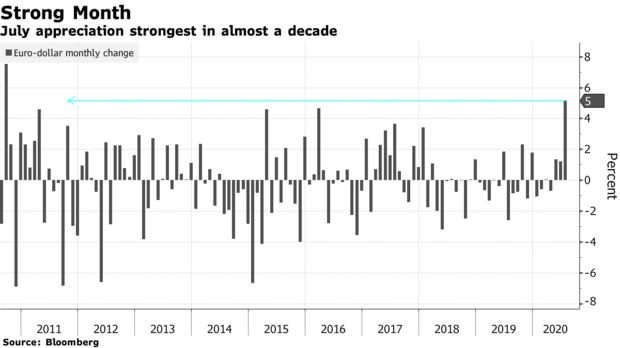 Maisch表示,当前汇率变动反映了美元的普遍疲软,表明美国“正在失去对疫情的控制”。跟踪美元兑一篮子10种货币走势的彭博美元指数,在7月份遭遇了10年来最糟糕的月度表现。
