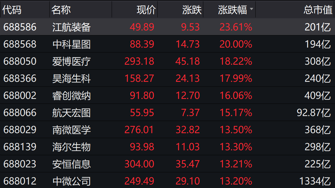 涨幅方面,今日军工板块表现异常抢眼,江航装备(688586.SH)以23.61%的涨幅领涨科创板,中科星图(688568.SH)、航天宏图(688066.SH)、盟升电子(688311.SH)等北斗导航概念股涨幅同样位居科创板前列。