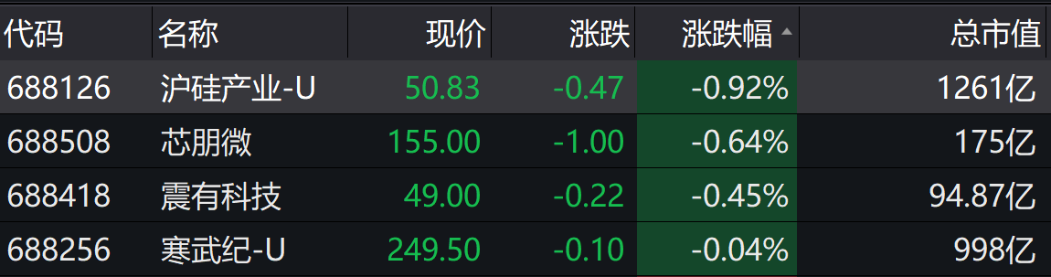 跌幅方面,今日仅4只个股收跌,分别是沪硅产业(688126.SH)、芯朋微(688508.SH)、震有科技(688418.SH)、寒武纪(688256.SH)。
