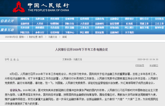 8月3日,央行召开2020年下半年工作电视会议,总结上半年各项工作,分析经济金融形势,对下半年重点工作作出部署。央行行长易纲作工作报告,央行党委书记郭树清主持会议并作总结。副行长陈雨露、潘功胜、范一飞、刘国强,派驻纪检监察组组长徐加爱等出席会议。