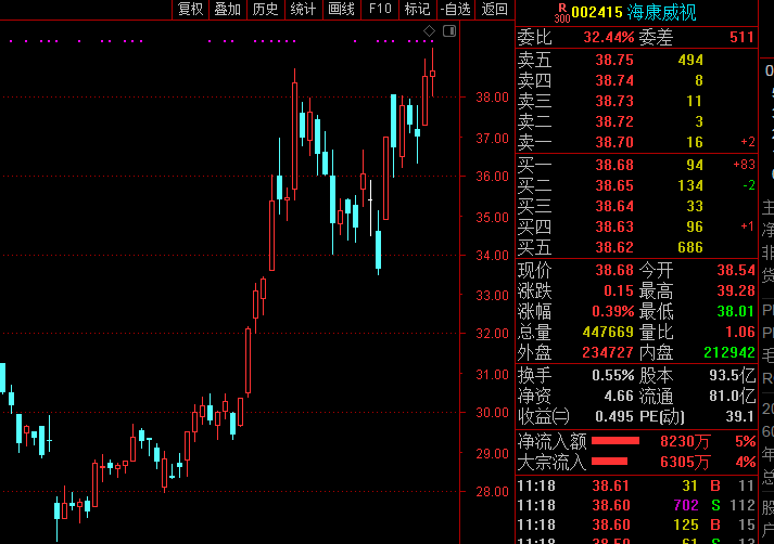 盘面上,海康威视现报38.85元,涨0.83%,年内已上涨21%。