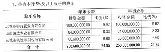 财报显示,截至2019年末,运城农商行持股比例超过5%的股东有三个,运城市御苑置业有限公司为第一大股东,持股比例9.92%;第二大股东为山西骏达木业有限公司(下称“骏达木业”),持股比例8.33%;第三大股东为运城市凯达印刷包装有限公司(下称“凯达印刷”),持股比例6.60%。