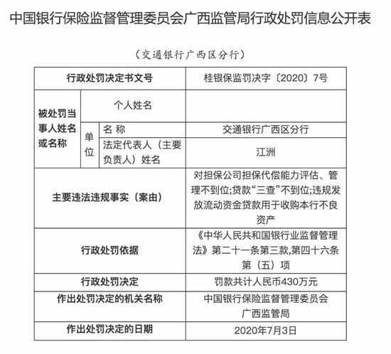 排在第三位的是交通银行广西壮族自治区分行,被广西银保监局处以430万元罚款。