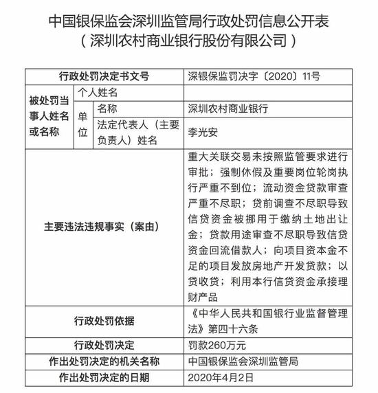 例如,深圳农商行因“信贷业务违规,违反审慎经营规则,违规流转信贷资产,贷后资金流向、用途及项目进度等管理、监督、执行不到位,内部管理与控制制度不健全或执行监督不力”,被处以260万元罚款,在地方银行中居“榜首”。