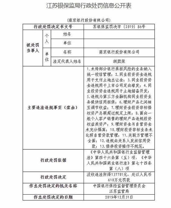 值得注意的是,不止这张610万元大额罚单,6月4日、5日两天内,江苏银保监局及其下属分局连续披露了21张有关南京银行的罚单,处理对象包括了南京银行总行、多地分行及其员工等,违法违规事由涉及其信贷、同业、理财等重点业务,累计罚没金额超1400万元。