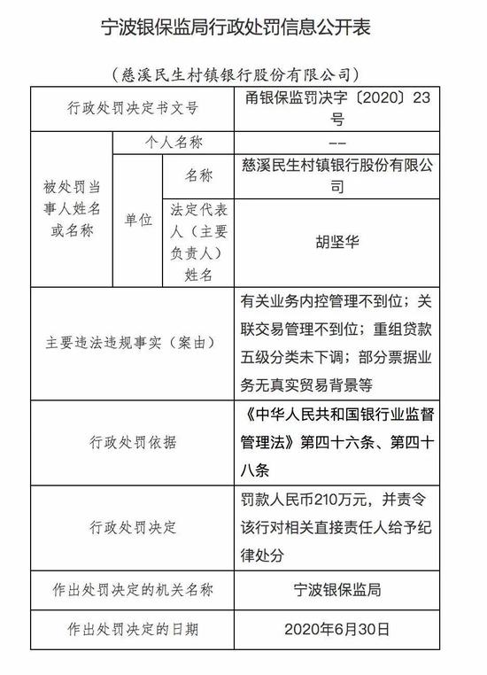 慈溪民生村镇银行紧随其后,因有关业务内控管理不到位;关联交易管理不到位;重组贷款五级分类未下调;部分票据业务无真实贸易背景等被处以210万罚款。