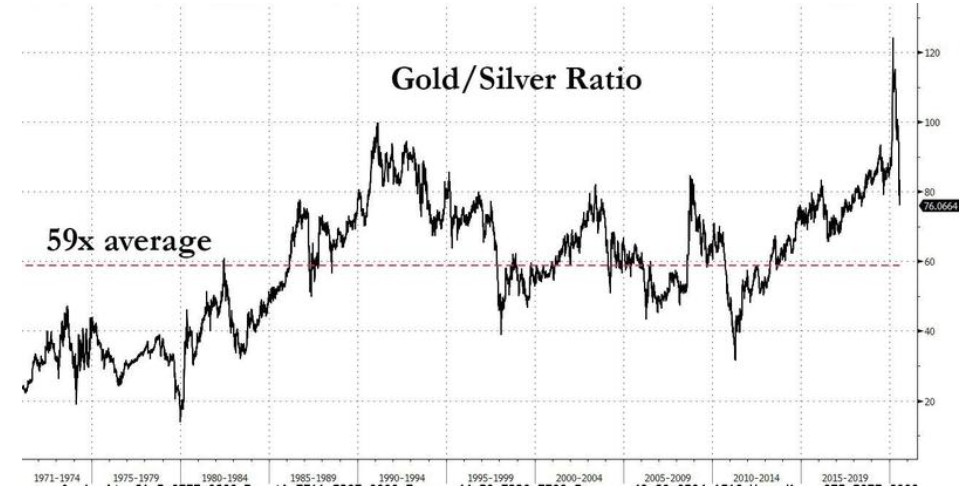 正如该行解释的那样,与黄金类似,投资者出于对当前经济政策的担忧,也增加了对白银的敞口。然而,相比黄金,白银受工业需求的影响更大,因此,这些增加的购买在经济封锁期间并不重要。金银比一度达到124的峰值,距离59倍的长期平均水平还有一段距离。