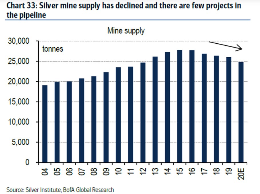 但根据美国银行的数据,将上涨约50%的不只是黄金:白银也受益于这一宏观背景,在所谓的“绿色”刺激方案的推动下,需求也会加强,因为大多数刺激方案都有环保方面的考虑。因此,美国银行还认为,白银明年升至每盎司35美元是一个可行的目标,更重要的是,该行强调“中期白银可能升至每盎司50美元”。