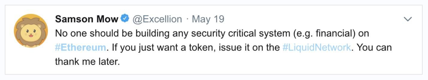 “没有人会在以太坊平台上构建任何安全(例如金融)系统。如果你想要token,你可以在Liquid网络上发行,以后你可以感谢我。”