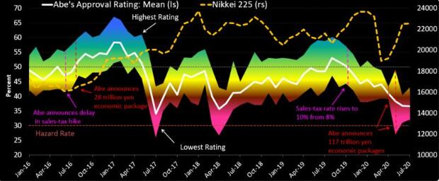 彭博社经济学家Yuki Masujima在最近的一份报告中写道,“安倍的支持率已经接近30%的关键水平,从历史来看,这对于一个内阁的寿命来说是一个潜在的危险门槛。经济衰退可能增加采取进一步经济支持措施的可能性”。
