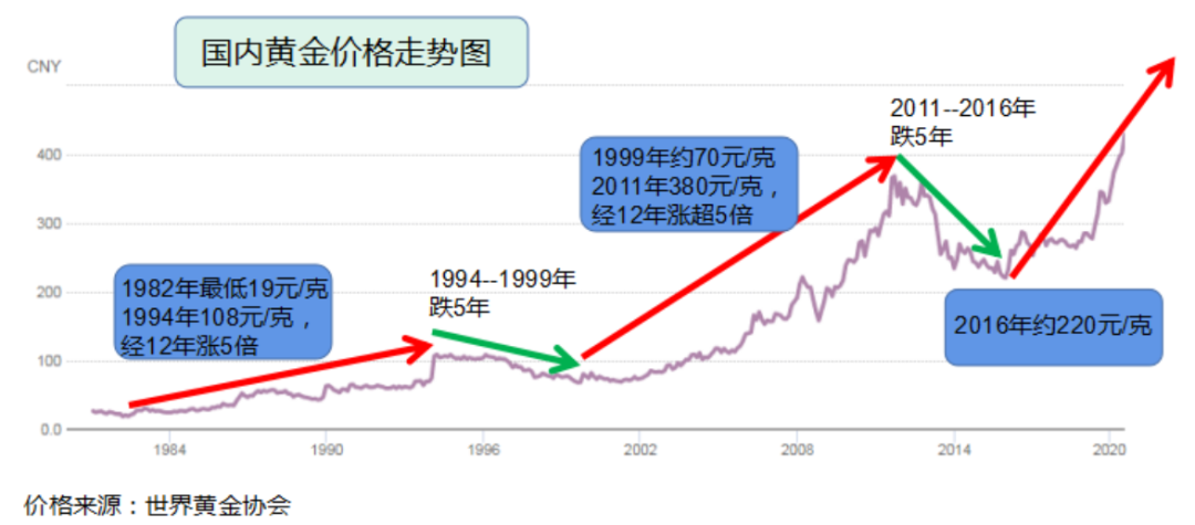 以世界黄金协会公布的国内黄金价格历史走势看,以人民币计价的金价大致经历了以下几个上涨阶段:(1)1982年-1994年约12年的时间从20元/克首次上涨至100元/克以上,此后大致有五年的下跌期,涨幅丧失35%;(2)1999年-2011年同样约12年时间从70元/克首次逼近400元/克大关,再次经历五年下跌期,涨幅丧失40%。(3)自2016年220元/克低点至今的上涨阶段。