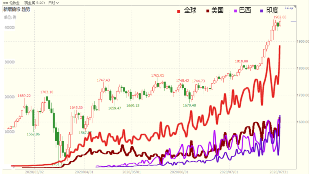 我们将国外新增确诊病例走势(下图)与伦敦金价格走势图叠加可以更清晰的看到,金价走势和新增病例趋势有较高的相似度,并且疫情变动的趋势性略微领先于金价的变动。3月下旬美国疫情暴发后,金价于3月下旬开始企稳回升;4月份全球新增病例趋势有所缓和,金价则在中旬首次触及每盎司1747美元后也陷入每盎司1710±50美元区域横盘振荡;5月下旬全球单日新增病例再上一个台阶,6月份以后新增病例不断增加,金价自6月初从每盎司1670美元低点开始启动新一轮行情,并屡创新高;目前单日新增病例大幅增加,黄金涨速也明显加快。