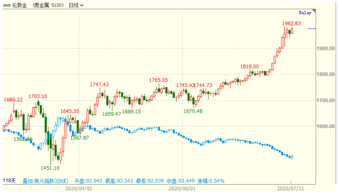 美元指数自3月中旬103左右高点到7月最低跌至92.5,跌幅10.19%,近几个月以来的持续下跌也间接反映出市场对其经济前景的暗淡预期,特别是7月份23个交易日仅6个交易日微涨,其余时间均为下跌,7月最大跌幅达5.23%,为近10年来最大值,可以说美元疲弱成为推动金价快速上行的直接因素(如下图所示美元、黄金价格走势图叠加)。