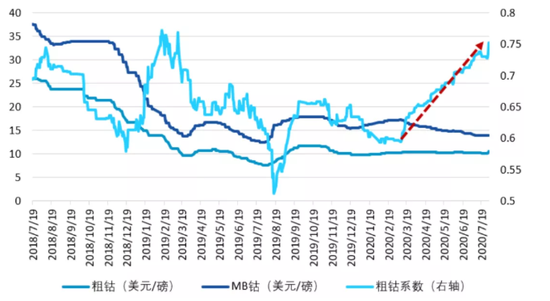通过对钴价和供需结构的长期跟踪,国泰君安有色团队看到5-6月中国钴原料进口下滑一半,钴行业月度供需显著短缺,目前钴原料供应紧张,粗钴系数大幅上涨。有色团队分析三季度中国钴原料进口仍将维持同比下滑趋势,整体产业链钴产品库存出现快速去化,未来原料短缺将逐步向钴产品短缺去传导,钴价看涨至40万/吨。